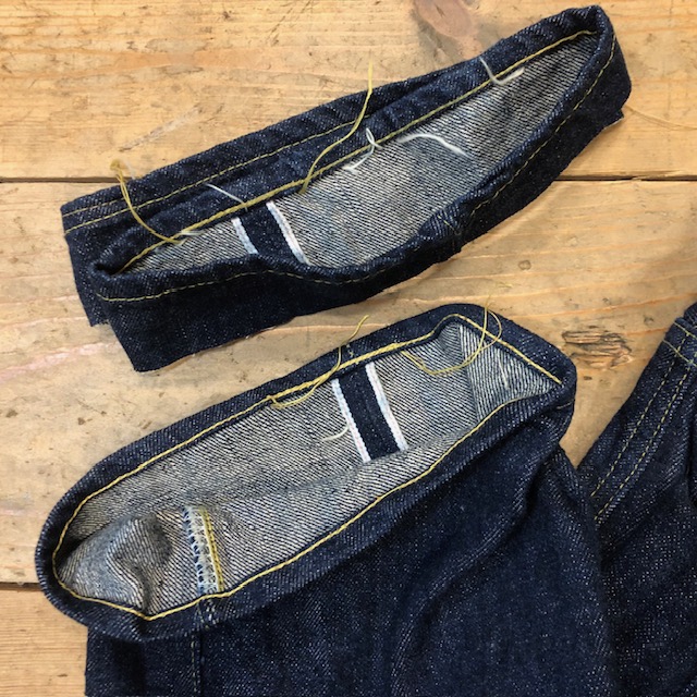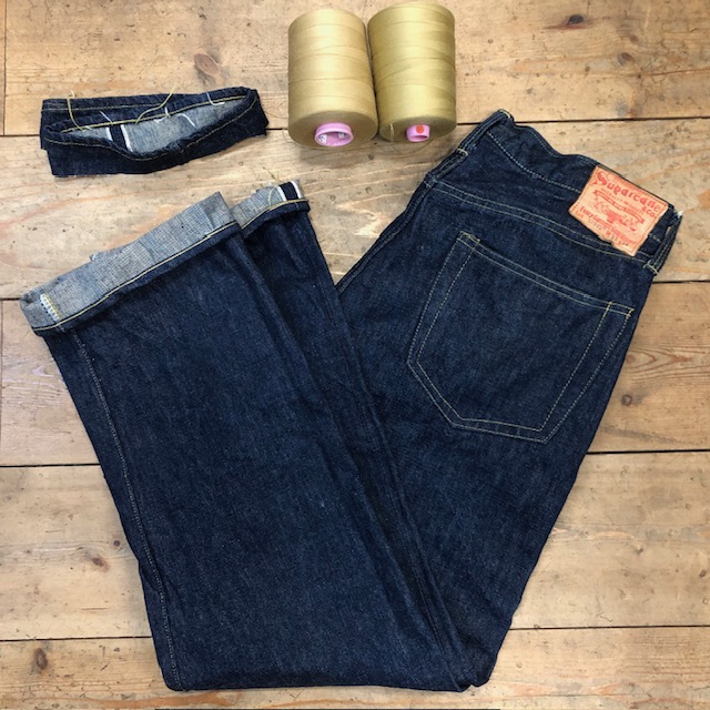 ジーンズ裾上げ 2025年10月23日 お買い上げいただいたシュガーケーンスーパーデニムSC49001。 1945年製の501のリプロダクションですが、裾始末が通常のものと異なり、巻き幅がやや広く、チェーンの縫い始めと縫い止まりの糸端が残されたままとなっています。 メーカーオリジナルの仕様に準じ、糸端を残して処理しております。 *当店で扱うスーパーデニムコレクタブルズはノンウォッシュのみの展開です。裾上げは、縮み分を見計らってカットすることも出来ますが、洗い上がりでの丈合わせの方がベターです。 «前 次»