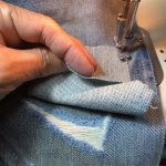 本日の修理品/シュガーケーン スタンダードジーンズ 2025年10月30日 シュガーケーン1947の修理続き。 プレスで伸びきった穴周辺の生地を追い込んで平面を出し、裏から接着芯地で固定。 今回は裏打ちするだけではなく、表からランダムにパッチワークをおこないます。 パッチワークには、ストックしている裁ち残りのデニム地を使用。 «前 次»