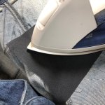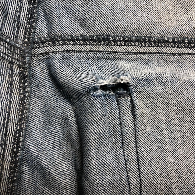 本日の修理品/トライアンフ ジーンズ 2025年11月21日 持ち込みの修理依頼で、後ろポケット留め部分が破れたポリウレタン混ジーンズ。 伸縮生地は、タタキ修理をおこなった跡がボコつくので、綺麗に仕上がり辛いです。その点もご了解いただいた上で作業を行いました。 裏から接着芯を大きめに貼って穴開き箇所にタタキを入れ、シームとポケット周りのコバステッチの上にミシンをかけて芯地の端を留め付けてあります。 «前 次»