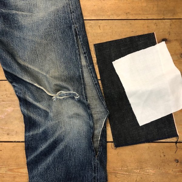 本日の修理品/トイズマッコイ 大戦モデルジーンズ 2025年10月09日 続いてパンクしている左膝のリペア。 一旦サイドシームを割って作業を行います。 ヒゲに沿って破れていますが、穴の周辺の生地が伸びており、当て布する前にアイロンで追い込んで形を整えてやる必要があります。 穴を覆うように接着芯地を貼り、さらに大きめのデニム生地で当て布します。 «前 次» 店長日記