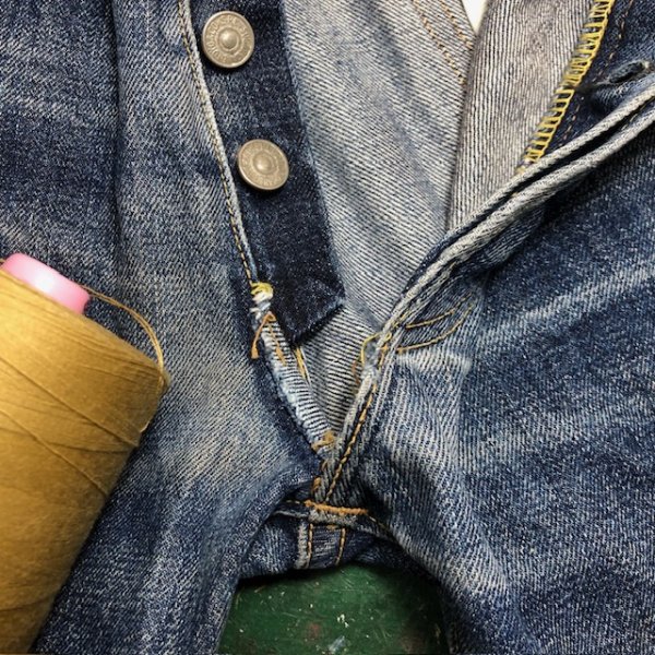 本日の修理品/シュガーケーン スタンダードジーンズ 2025年10月17日 細身のSC42021。 ロングセラーSC41947と共地で継続生産しています。 前開き止まりのクロッチステッチが切れて大きく開いています。 現代のジーンズではここに閂止めが入りますので、まずこういうことはありませんが、ビンテージのリプロ品では綿糸でコの字ステッチが入っているだけなのでよく起こります。 生地が破れているわけではないので、地縫いミシンで再縫製して修理完了。 «前 次» 店長日記