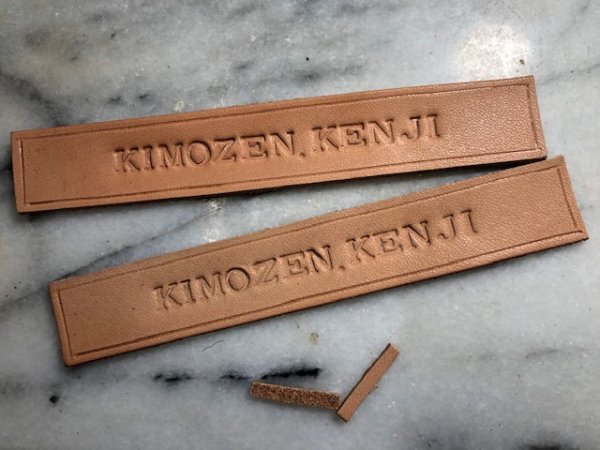 ネームプレート制作 2025年11月26日 沢山のレザージャケットをお持ちのお客様からのリピート受注分。 縫い付け用のネン押しをし、乾燥後発送いたします。 A-2、B-10、B-15などに縫い付けるネームプレートは、縦は約18ミリ(サイズの変更も可能)、横は文字数により100~120ミリで製作しています。ヌメ革にお客様の指定の文字を刻印します。 次» 店長日記